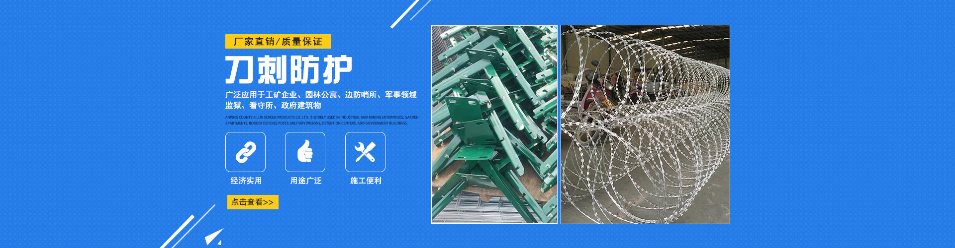 安平初日金屬絲網制品有限公司是一家集生產、深加工、銷售、安裝于一體的絲網生產企業,公司主要產品有刀片刺繩、刺絲滾籠、刺繩支架等多種產品,公司設備精良,科學管理,為廣大客戶提供高質量產品,深受客商的信賴與支持。